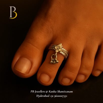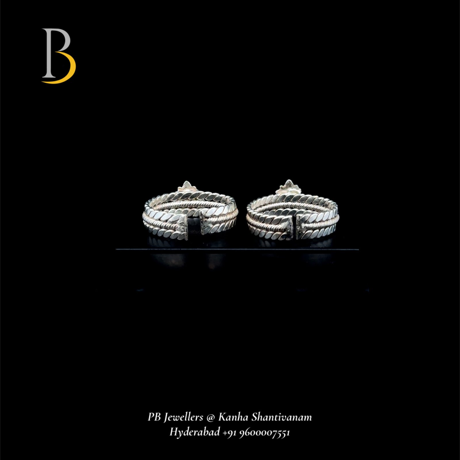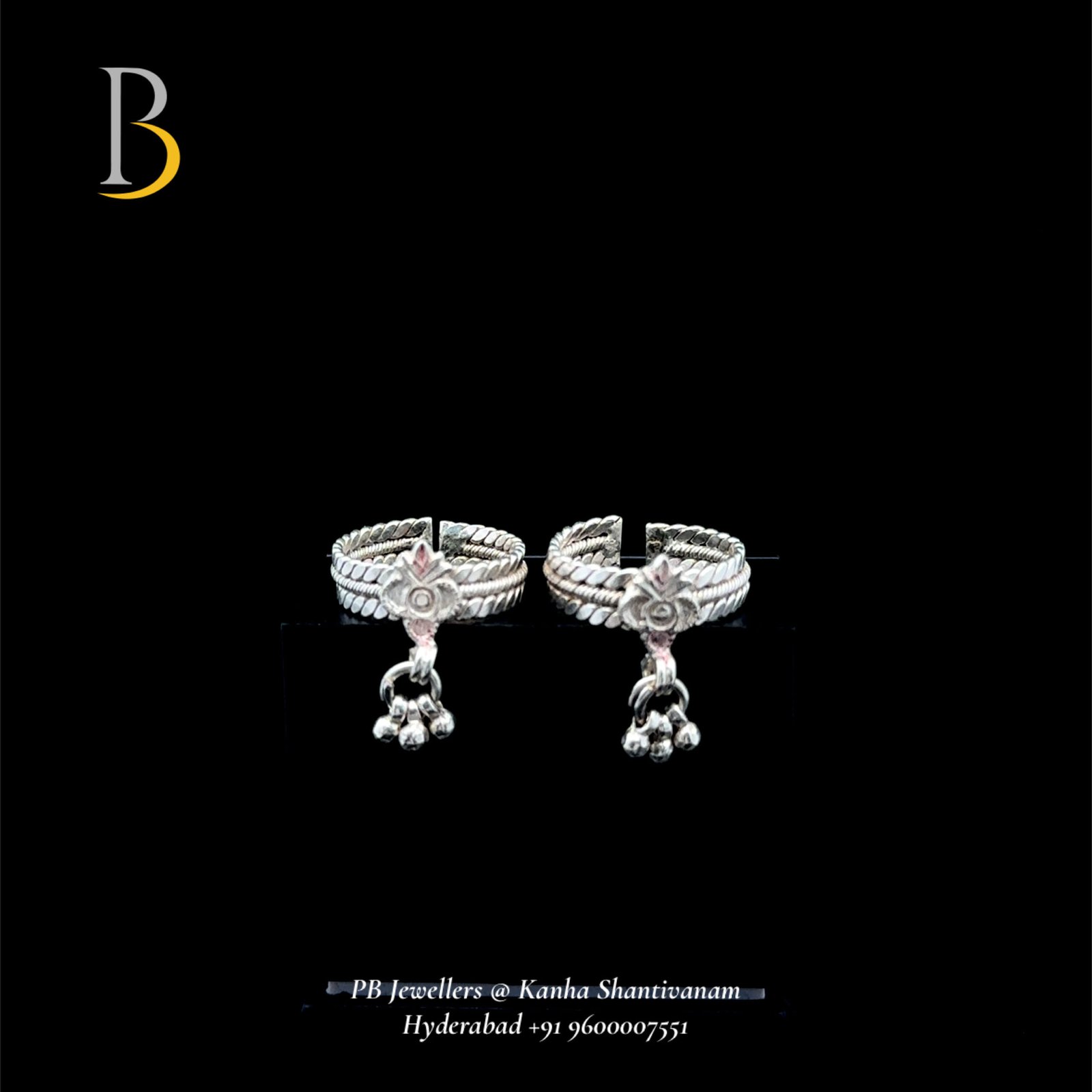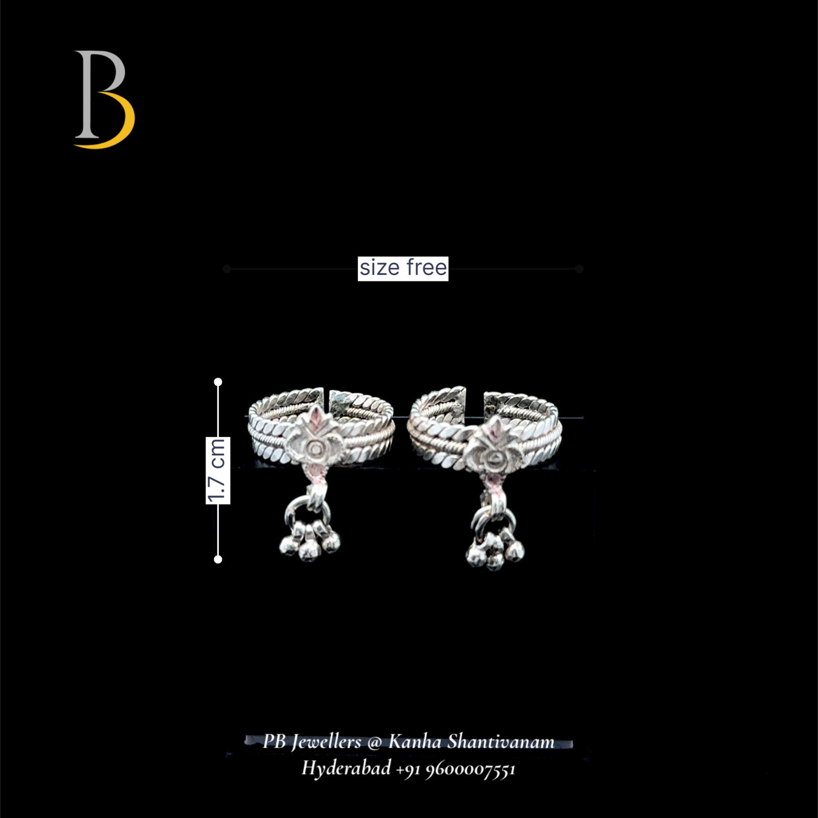 Celebrate tradition with this beautifully handcrafted 92.5 Sterling Silver Toe Ring, designed with a rope-textured band, central floral motif, and elegant hanging ghungroo-style beads. Standing 1.7 cm tall, this adjustable toe ring adds a bold and festive charm to your feet. Its free-size fit makes it perfect for weddings, classical dance wear, festive looks.
