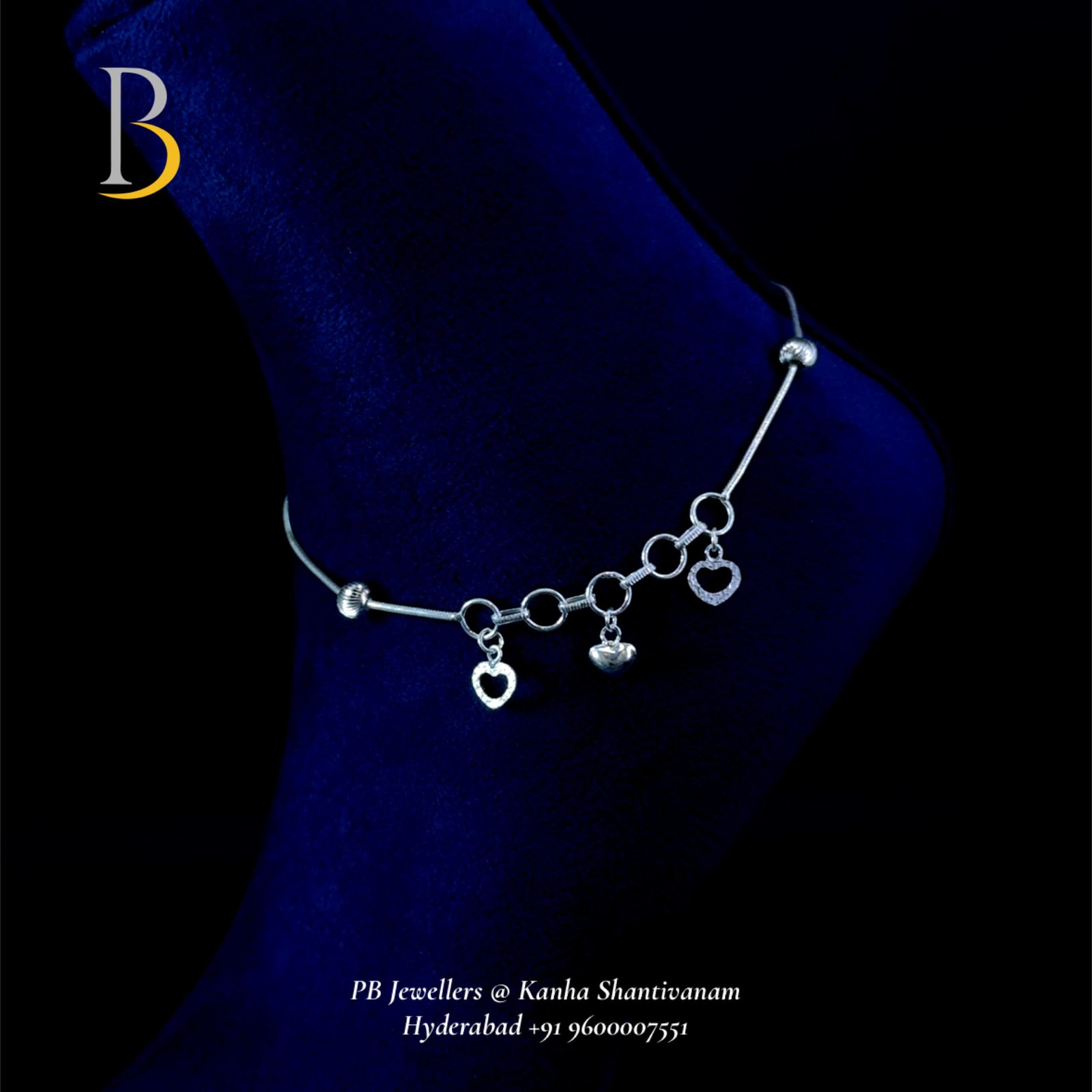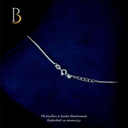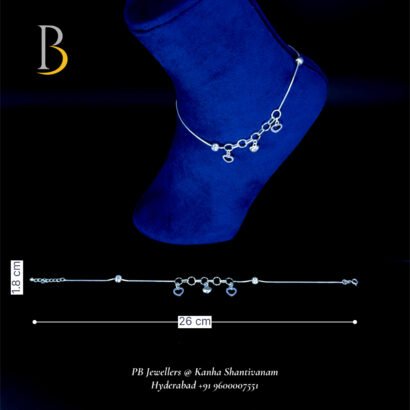 Showcase your feminine charm with this elegant 92.5 silver anklet from PB Jewellers at Kanha Shanti Vanam, Hyderabad. Designed with a sleek wire chain and adorned with delicate dangling heart charms and shiny beads, this anklet adds a touch of romance and elegance to your feet.