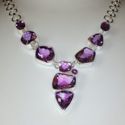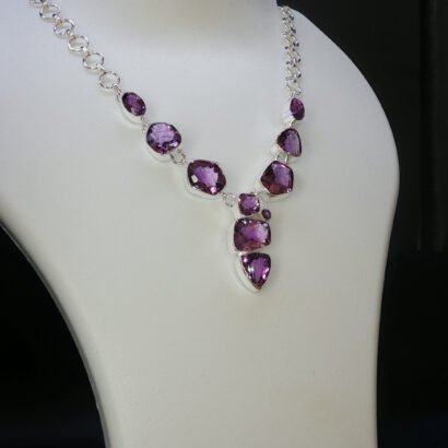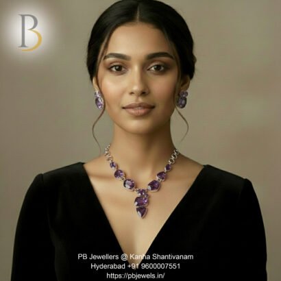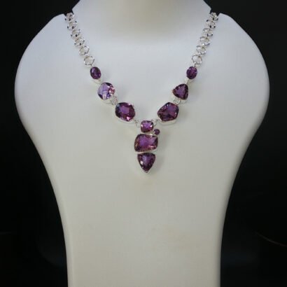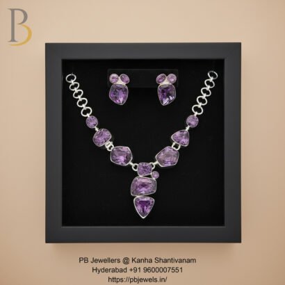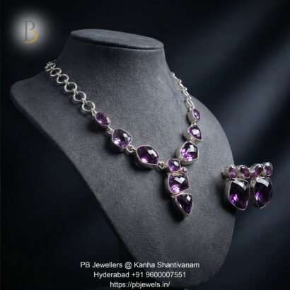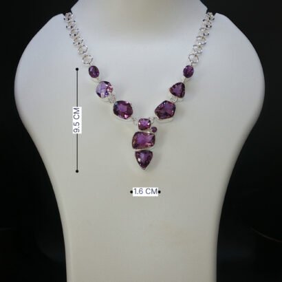 Elegant 92.5 sterling silver necklace set adorned with rich purple amethyst gemstones. Designed to exude regal charm and timeless beauty, this handcrafted piece is perfect for festive occasions, evening wear, and sophisticated statement styling.