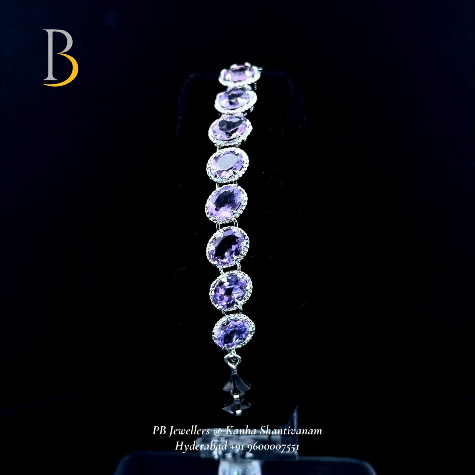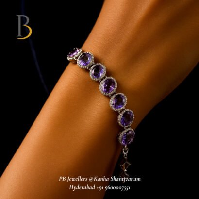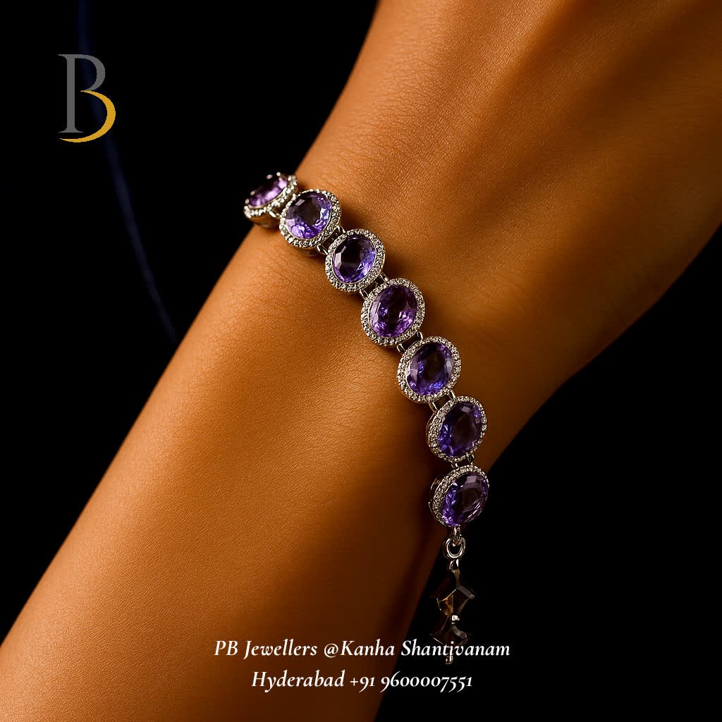 Elevate your elegance with this exquisite Amethyst Silver Bracelet from PB Jewellers, nestled in the serene heart of Kanha Shantivanam, Hyderabad. Featuring eight oval-cut amethyst gemstones, each encircled by a delicate halo of shimmering swiss zirconia stones, this bracelet is a timeless expression of luxury and feminine grace .Perfect for both traditional and modern ensembles.