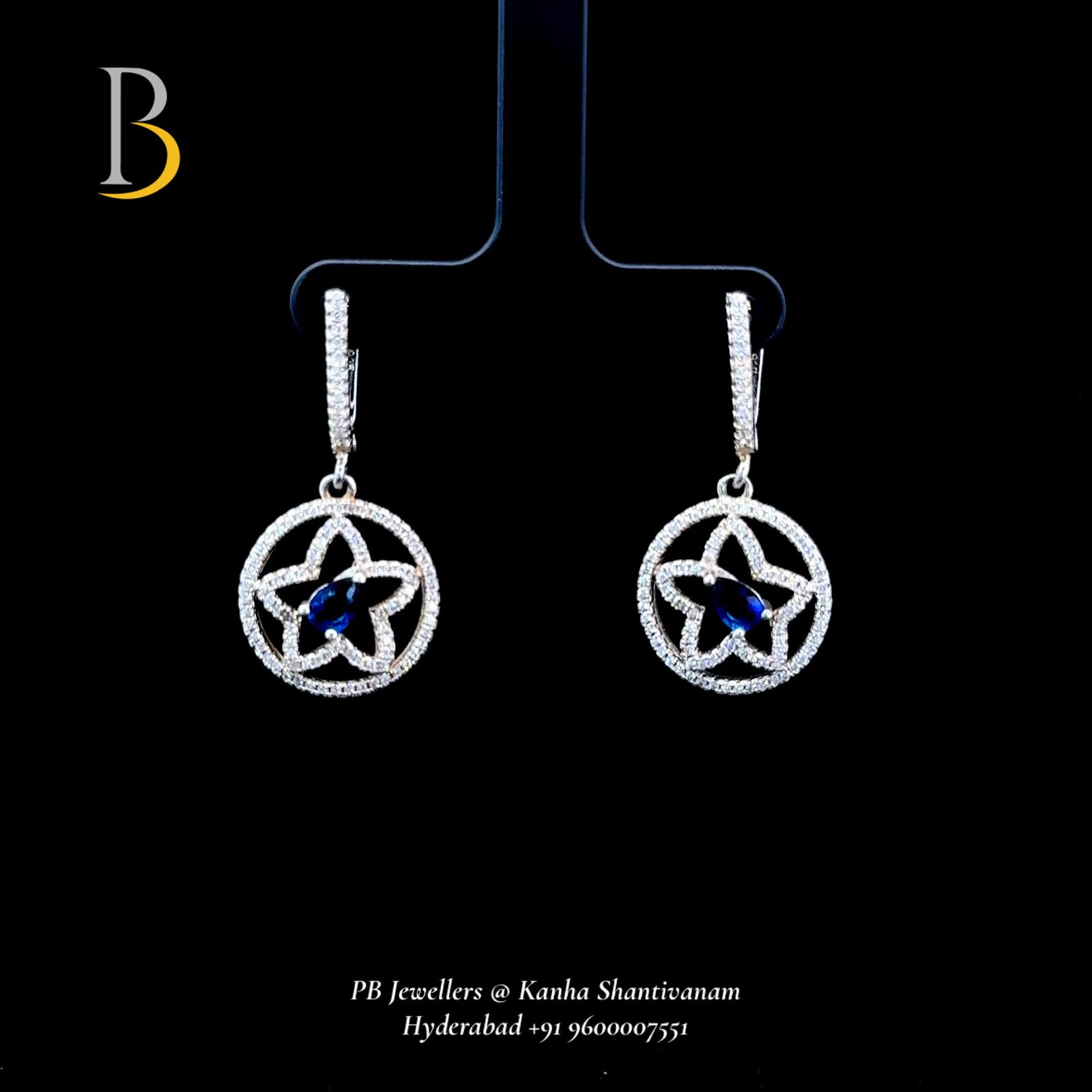 Crafted in 92.5 sterling silver, these elegant star-in-circle drop earrings feature a deep blue sapphire highlighted by sparkling cubic zirconia. A refined celestial design perfect for evening wear, celebrations, or adding a touch of modern luxury to your look.
