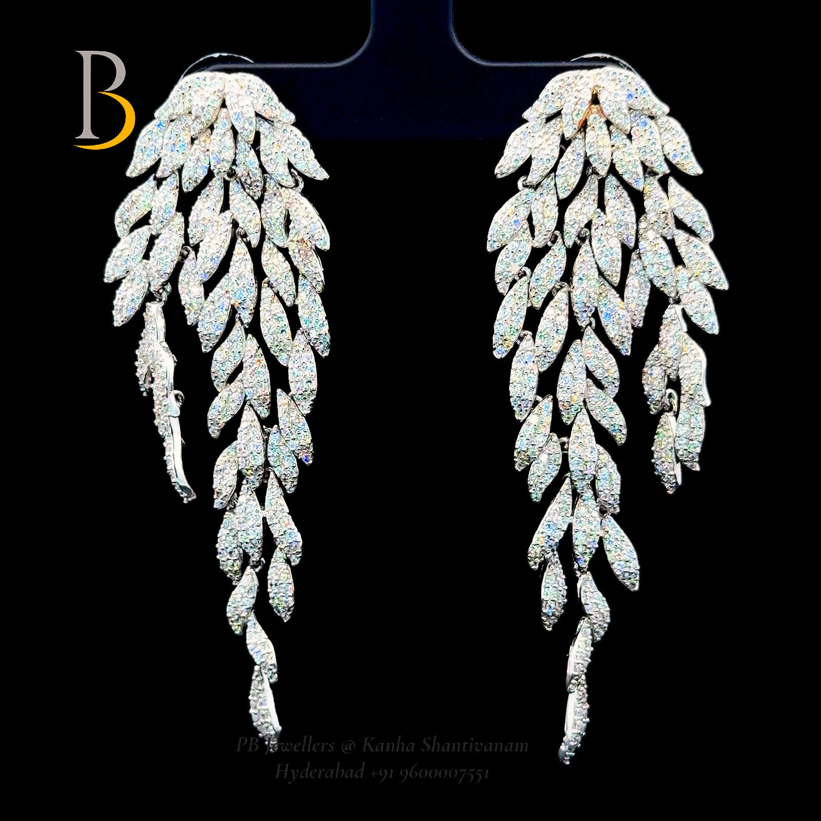 Exquisitely designed in 92.5 sterling silver, these cascading leaf earrings are adorned with shimmering Cubic Zirconia. Their graceful movement and radiant sparkle create a luxurious statement, perfect for weddings, festive occasions, and elegant evening wear.