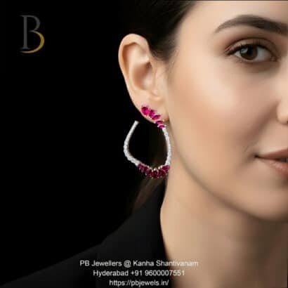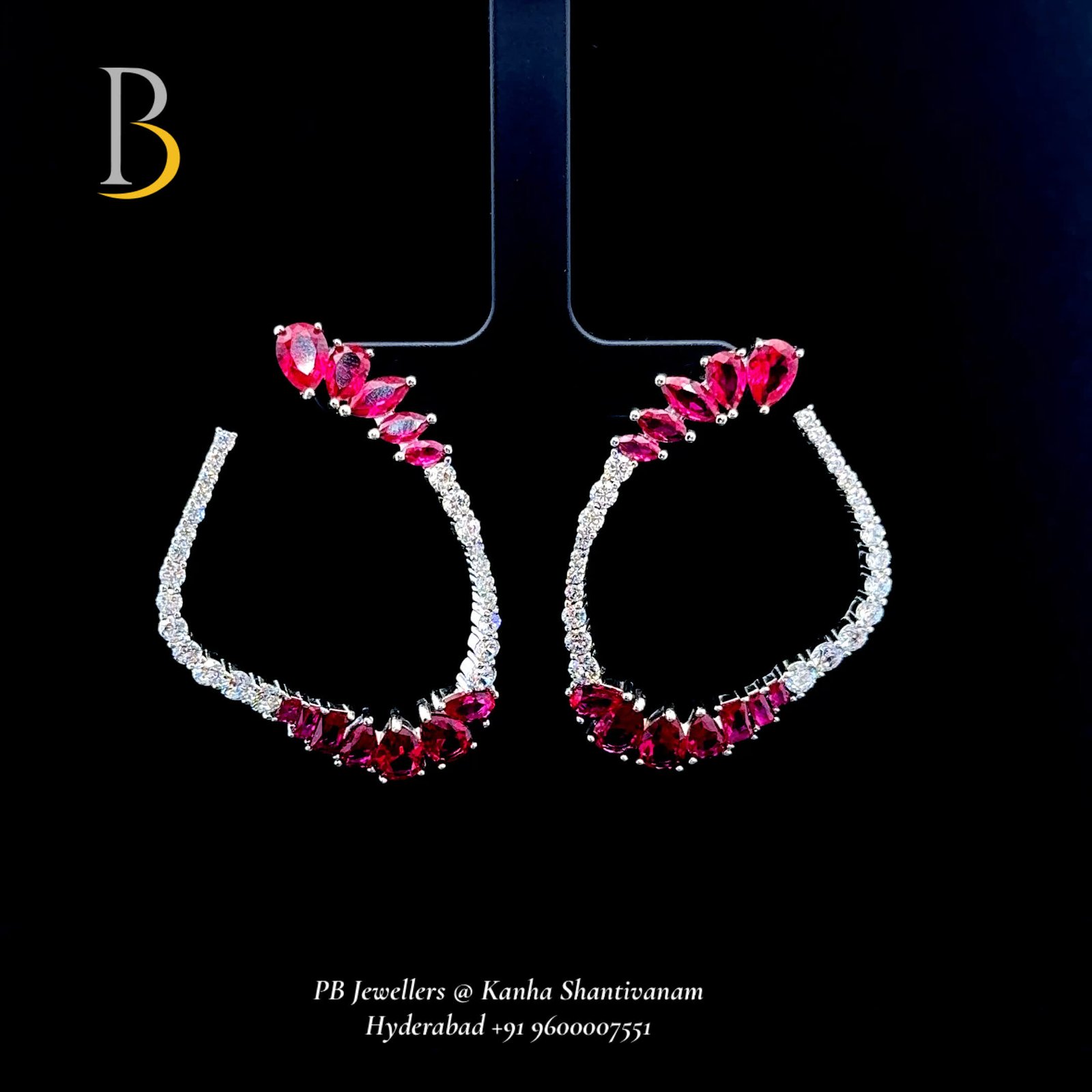 Crafted in 92.5 sterling silver, these elegant hoop earrings feature vibrant ruby gemstones accented with sparkling white CZ. A bold yet graceful design that adds glamour and confidence, perfect for festive wear, parties, or sophisticated everyday styling.