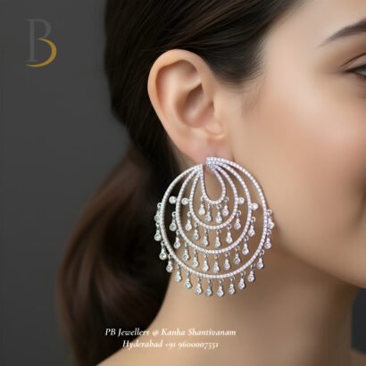 Intricately crafted in 92.5 sterling silver, these grand chandbali earrings feature cascading cubic zirconia drops that shimmer beautifully. A statement blend of traditional charm and modern brilliance, perfect for weddings, festive occasions, and elegant evening wear.
