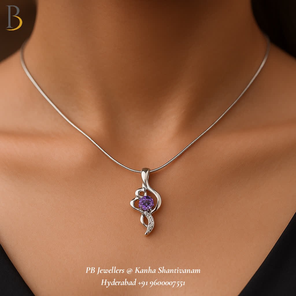An elegant 92.5 sterling silver pendant featuring a graceful swirl design adorned with a natural amethyst centerpiece and subtle sparkling accents. Artistic and refined, this handcrafted piece blends modern elegance with timeless charm, perfect for daily wear, gifting, and special occasions.