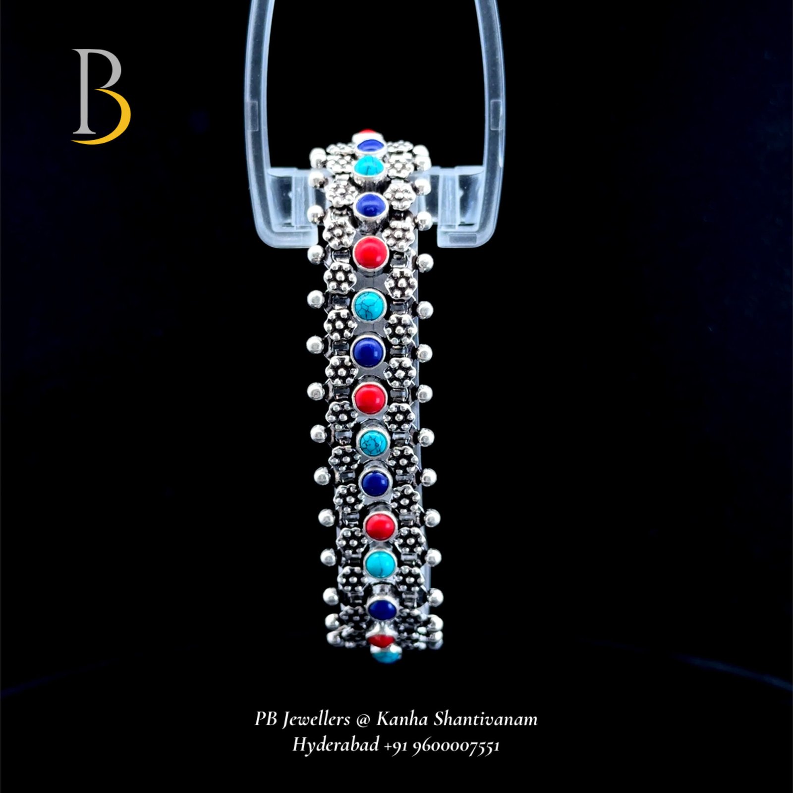 Add a pop of color and culture to your jewelry collection with this exquisite Oxidized Silver Multicolor Gemstone Bracelet. Featuring vibrant turquoise, red coral, and lapis lazuli gemstones, this bracelet showcases intricate silver detailing and a timeless design. Perfect for traditional and festive occasions, it adds a unique touch to your outfit while exuding ethnic charm and craftsmanship.